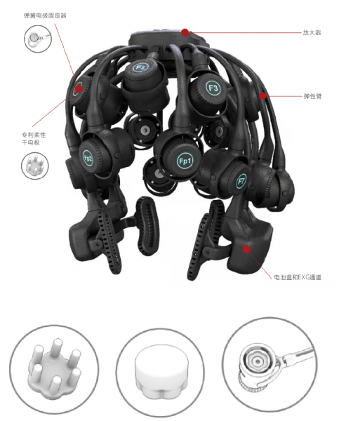 • 干电极与无线放大器一体化设计,无需导电凝胶,高效率采集;